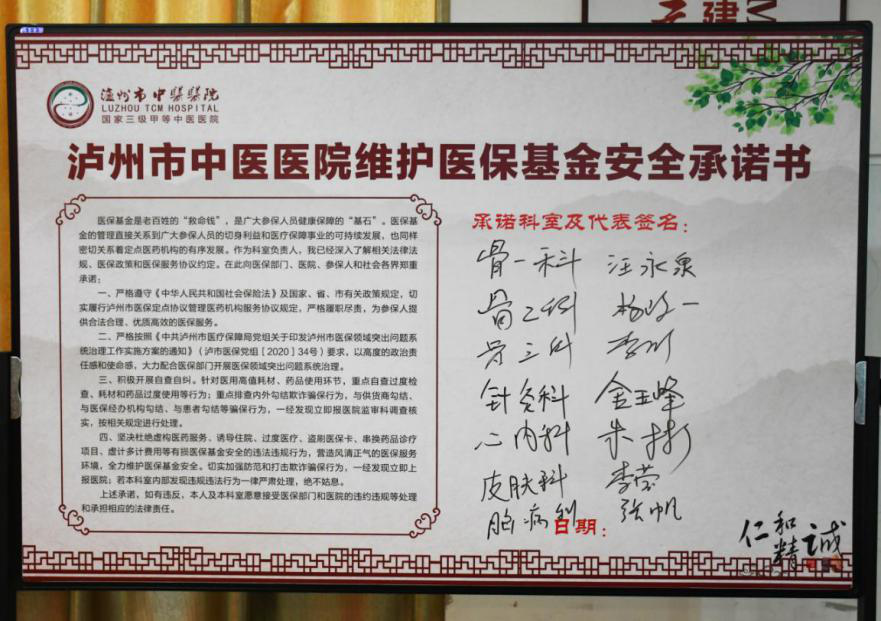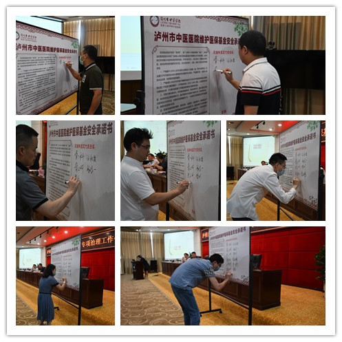 7個(gè)科室代表依次上臺(tái)簽署《瀘州市中醫(yī)醫(yī)院維護(hù)醫(yī)?;鸢踩兄Z書(shū)》。
