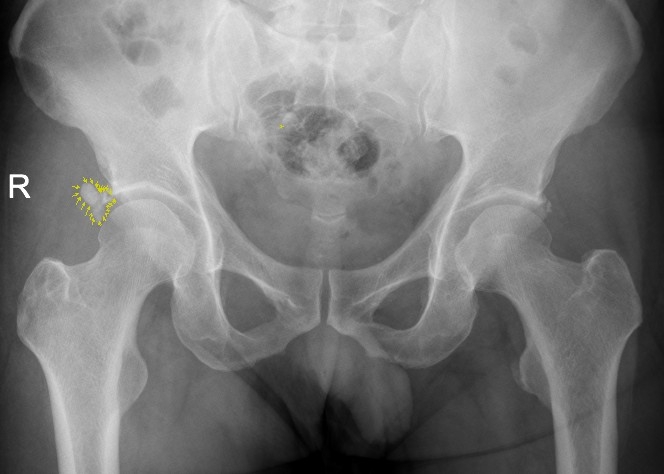 該患者為男性患者,47歲。右髖部疼痛7個(gè)多月,曾斷續(xù)就醫(yī),未明確診斷,疼痛時(shí)緩時(shí)重。入院前兩天,右髖部劇烈疼痛,患髖不能伸直,只能左側(cè)臥位,謂之“坐臥不寧”,需家人攙扶下才能勉強(qiáng)行走。經(jīng)臨床經(jīng)驗(yàn)豐富的骨三科主任、主任中醫(yī)師李彬以“右髖關(guān)節(jié)盂唇病變”收入住院治療,經(jīng)X光核磁共振檢查,患者右髖關(guān)節(jié)盂唇鈣化。