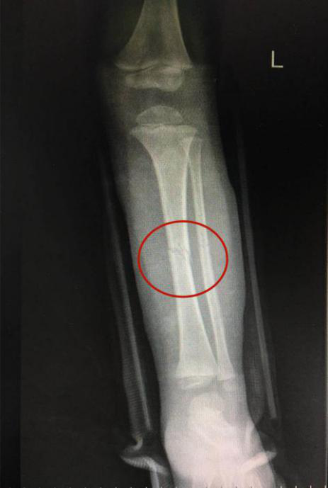 經(jīng)當(dāng)?shù)蒯t(yī)院照X光顯示,橦橦左脛腓骨中段骨折,建議全身麻醉下行彈性髓內(nèi)釘手術(shù)。