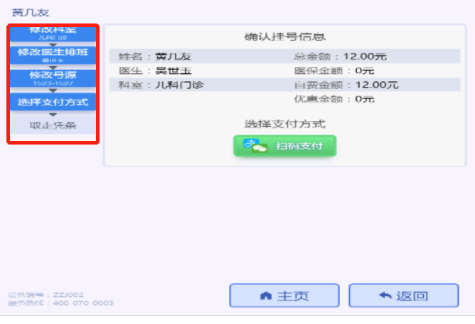 自助選擇對應(yīng)科室、醫(yī)生、就診時間段進行掛號。支持支付寶、微信掃碼支付。如需修改掛號信息,點擊左側(cè)對應(yīng)信息進行修改。