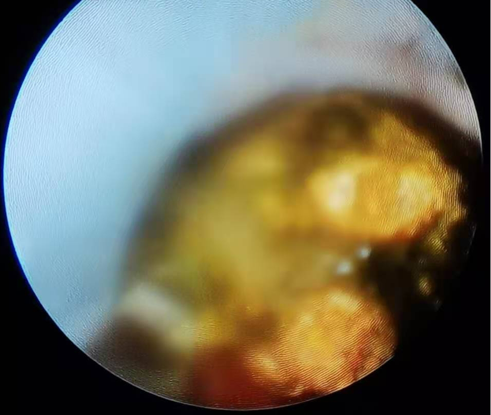 術(shù)中,醫(yī)生通過(guò)竇道直達(dá)結(jié)石部位,使用內(nèi)鏡配合鈥激光碎石,取出大量結(jié)石。一周后,在局麻下經(jīng)T管竇道再次用膽道鏡探查并將剩余的結(jié)石全部取出。