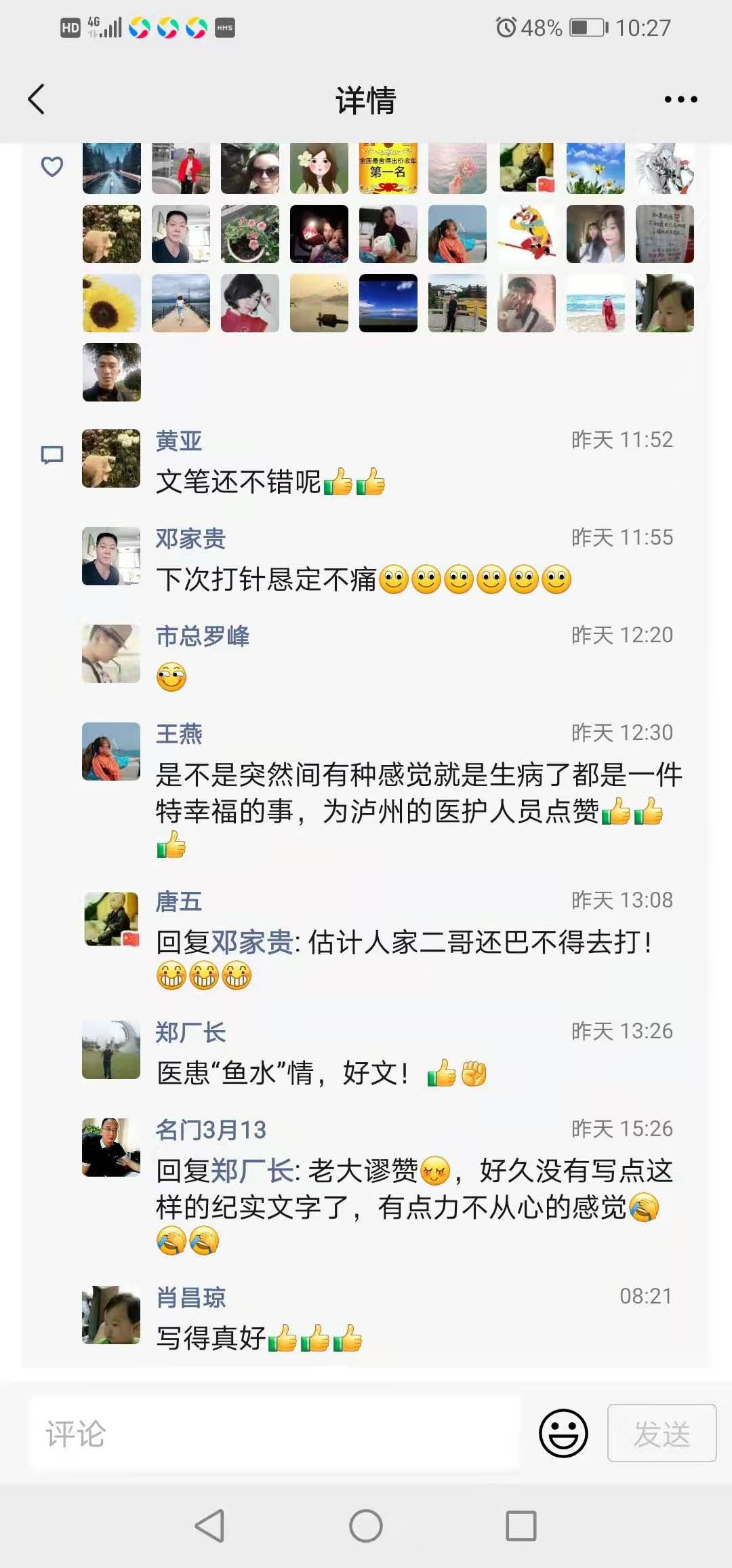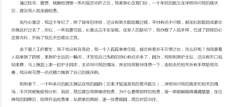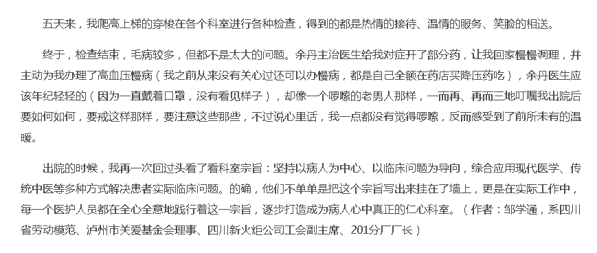 患者鄒學(xué)通,四川省勞動(dòng)模范、瀘州市關(guān)愛基金會(huì)理事、四川新火炬公司工會(huì)副主席、201分廠廠長(zhǎng)。和他進(jìn)行交流時(shí),他表示,來瀘州市中醫(yī)院心內(nèi)科就診,心情從忐忑、緊張變化到放心、舒心最后升華到感動(dòng)、幸福,因此,他一定要將這種良好的就醫(yī)體驗(yàn)感寫下來并分享出去,出院后,他主動(dòng)將文章實(shí)名投稿給了媒體,并將文章擴(kuò)散到朋友圈,得到了“圈”內(nèi)人士的紛紛好評(píng)。