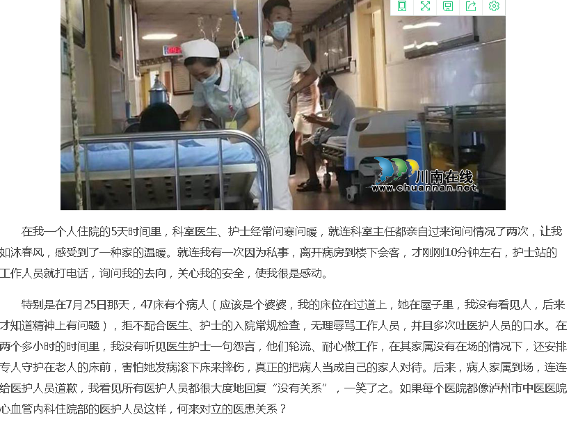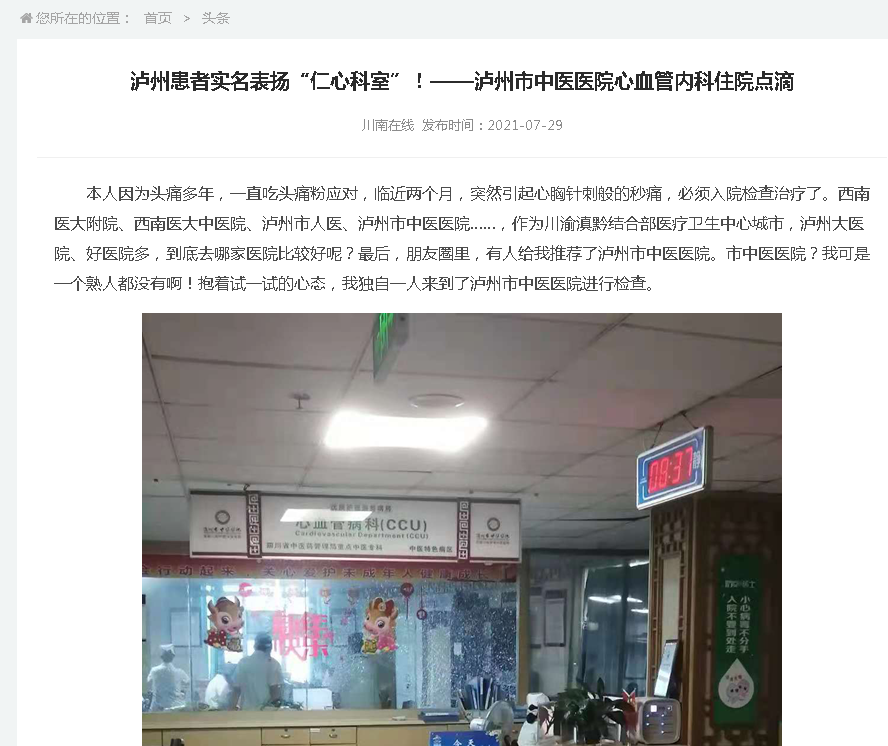 《瀘州患者實(shí)名表?yè)P(yáng)“仁心科室”!——瀘州市中醫(yī)醫(yī)院心血管內(nèi)科住院點(diǎn)滴》全文內(nèi)容如下: