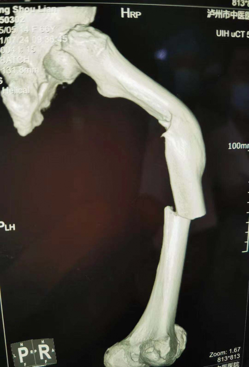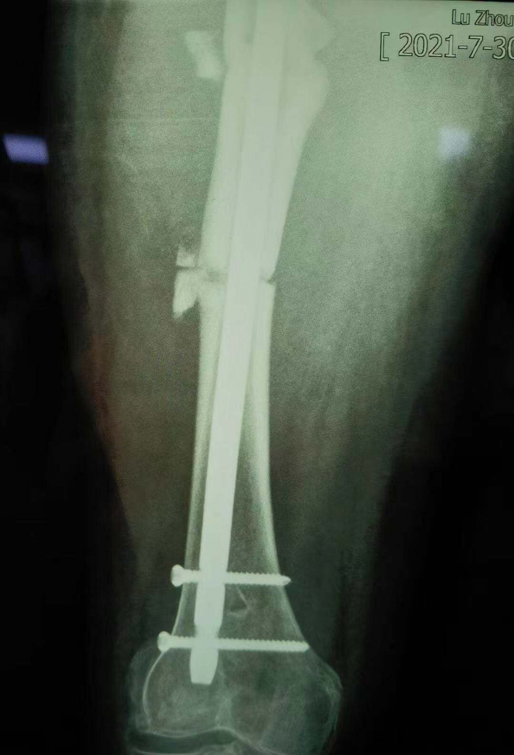 張女士家住瀘縣云錦鎮(zhèn),常年在家務(wù)農(nóng)。近日,她在家門口壩子走路時,不小心把大腿摔斷,家人隨即打了120,送到當?shù)鼗鶎俞t(yī)院進行救治。因她的腿有基礎(chǔ)疾病,傷情較為嚴重,7月23日,又慕名轉(zhuǎn)送到了瀘州市中醫(yī)醫(yī)院骨傷一科進行治療。