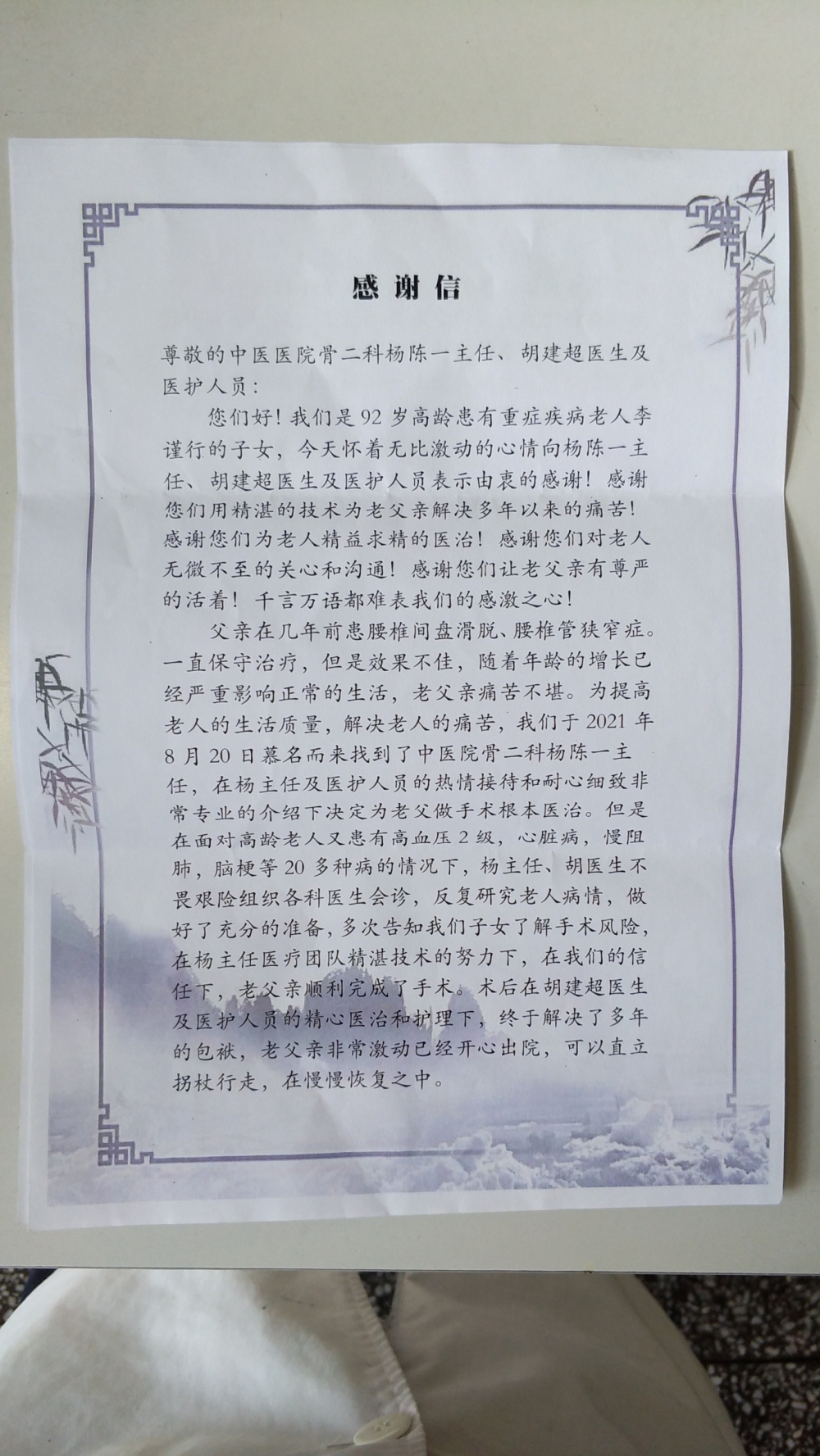 病房外的過道上,李謹行老人時常進行恢復(fù)訓(xùn)練,來來回回走好幾趟,腳步快得完全不像一位92歲剛做完手術(shù)的老人。家人們叫他慢一點,他笑著問:“這次能給我打多少分?”引得大家一陣笑,紛紛說“一百分”!