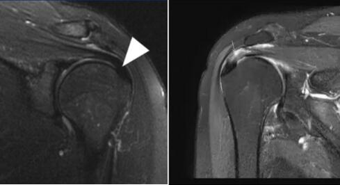 正常肩袖核磁共振圖像 ???肩峰撞擊后導(dǎo)致肩袖上表面撕裂