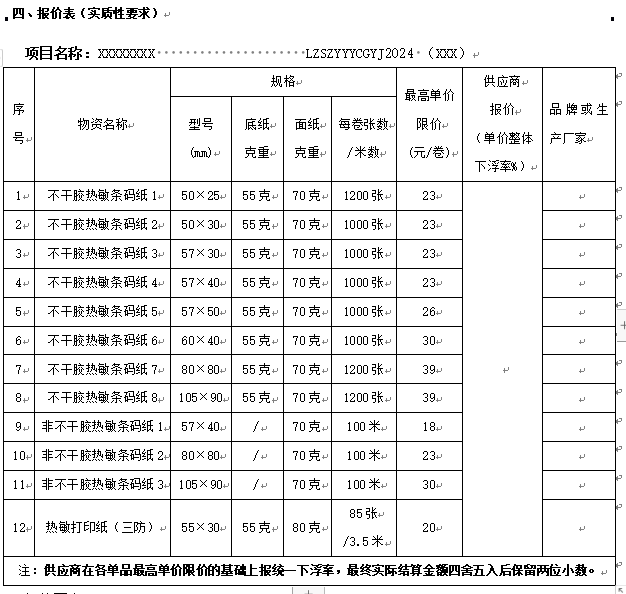 一、項(xiàng)目編號(hào)LZSZYYYCGYJ2024(22)二、項(xiàng)目名稱瀘州市中醫(yī)醫(yī)院熱敏條碼紙補(bǔ)充產(chǎn)品定點(diǎn)供應(yīng)采購(gòu)項(xiàng)目 三、變更內(nèi)容1.采購(gòu)文件第三章 四、報(bào)價(jià)表原為:現(xiàn)更正為:2.采購(gòu)文件第一章 八、遞交響應(yīng)文件截止時(shí)間更正為:2024年6 月14 日上午9:00時(shí)止。文件接收時(shí)間更正為:2024年6 月...
