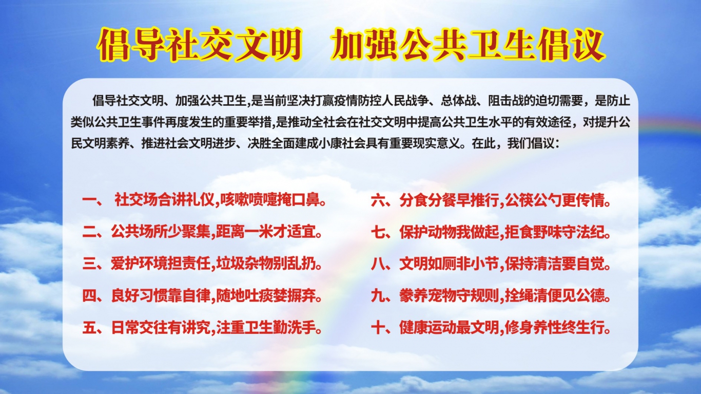 倡導(dǎo)社交文明、加強(qiáng)公共衛(wèi)生,是當(dāng)前堅(jiān)決打贏疫情防控 人民戰(zhàn)爭(zhēng)、總體戰(zhàn)、阻擊戰(zhàn)的迫切需要,是防止類似公共衛(wèi)生 事件再度發(fā)生的重要舉措,是推動(dòng)全社會(huì)在社交文明中提高公 共衛(wèi)生水平的有效途徑,對(duì)提升公民文明素養(yǎng)、推進(jìn)社會(huì)文明 進(jìn)步、決勝全面建成小康社會(huì)具有重要現(xiàn)實(shí)意義。在此,我們 倡議:-、 社交場(chǎng)合講禮...